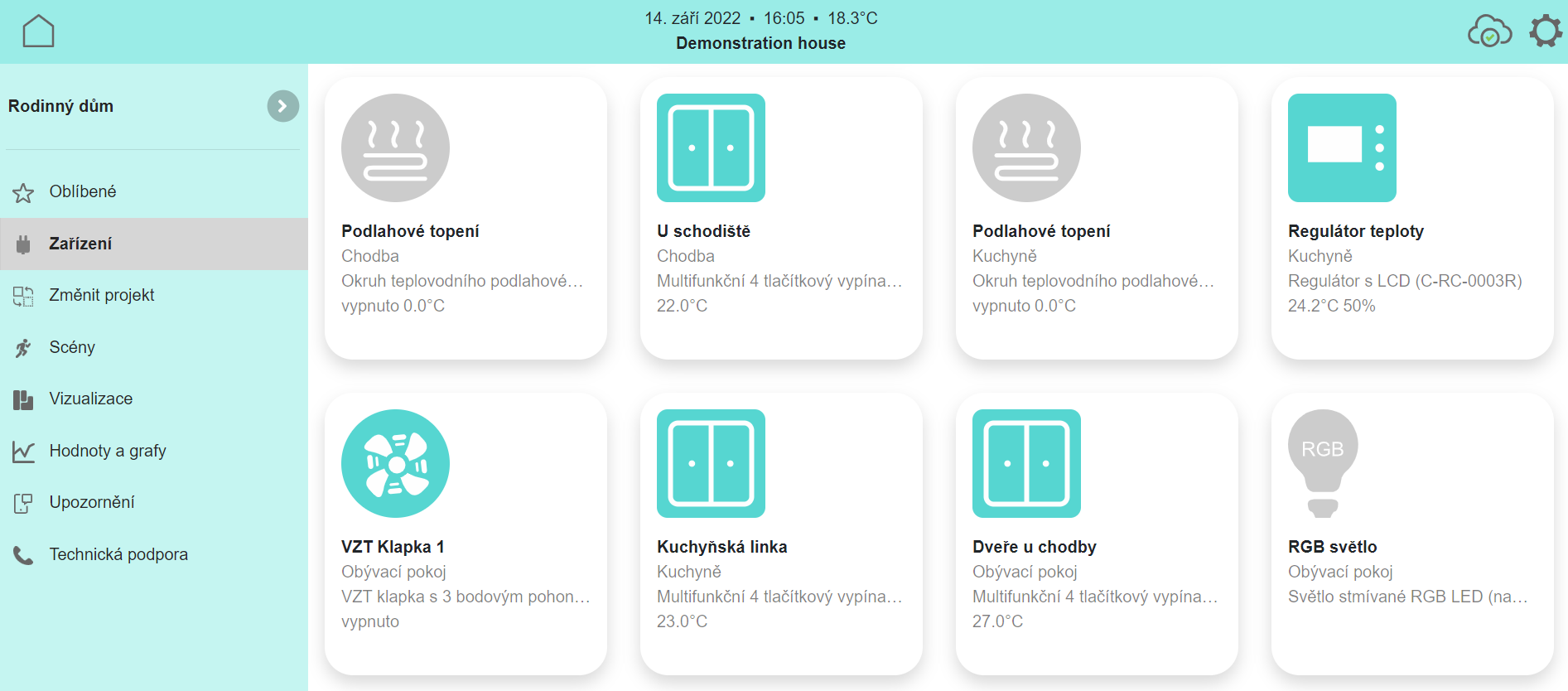 Standardně není nutné v projektech zobrazovat jednotlivá zařízení, protože základní ovládání se provádí prostřednictvím služeb. Přístup k zařízením je určen hlavně pro instalační partnery nebo znalé uživatele a v oprávněních uživatele musí být tato volba povolena.
