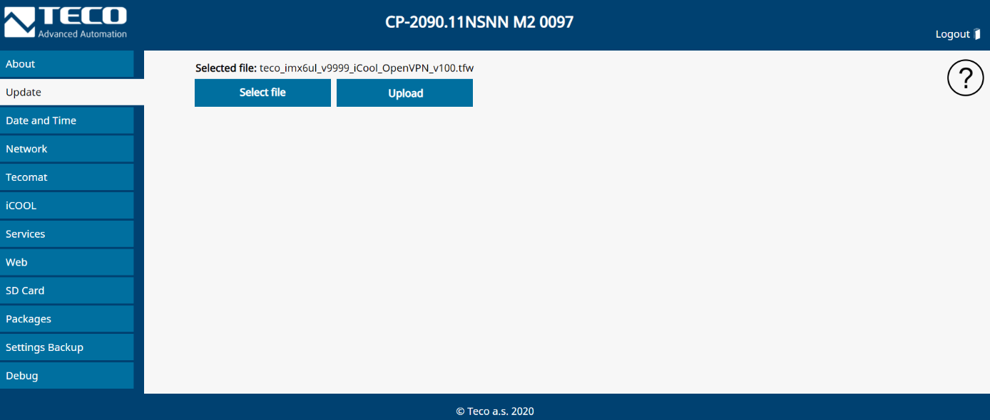 Instalovat OEM balíček iCOOL 4 je možné jen na řadu jednotek CP-2xxx s verzí FW (Version OS) 3.8. V případě nižší verze je nezbytné upgradovat pomocí Firmware Updater (součástí Mosaic). Instalovat balíček teco_imx6ul_v9999_iCool_OpenVPN_v102.tfw je možné pouze s verzí FW 3.8 a vyšší!