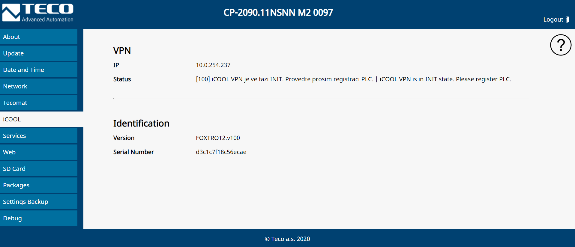 [100] iCOOL VPN je ve fazi INIT. Proveďte prosím registraci PLC.