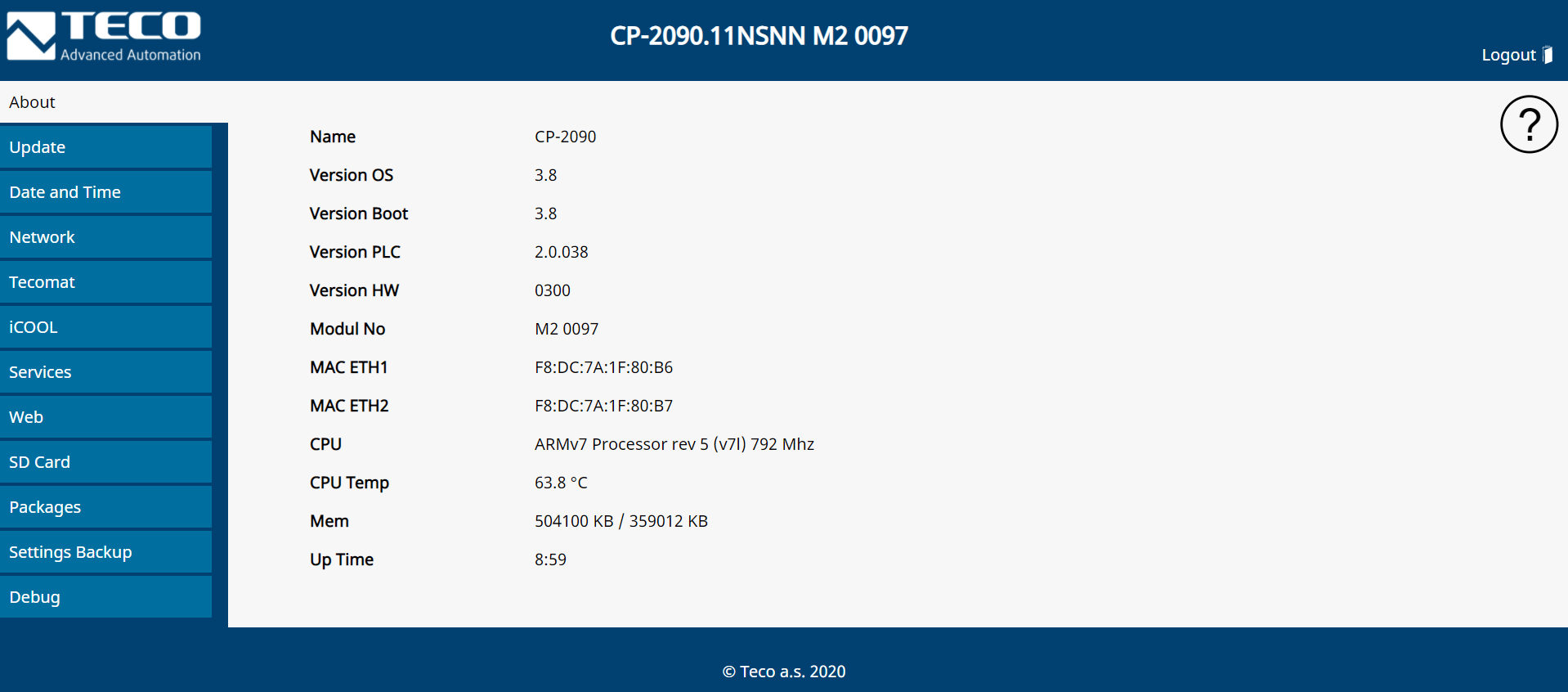 Ověření verze FW v PLC v části About (https://192.168.134.176:8443/cgi-bin/about.cgi):
