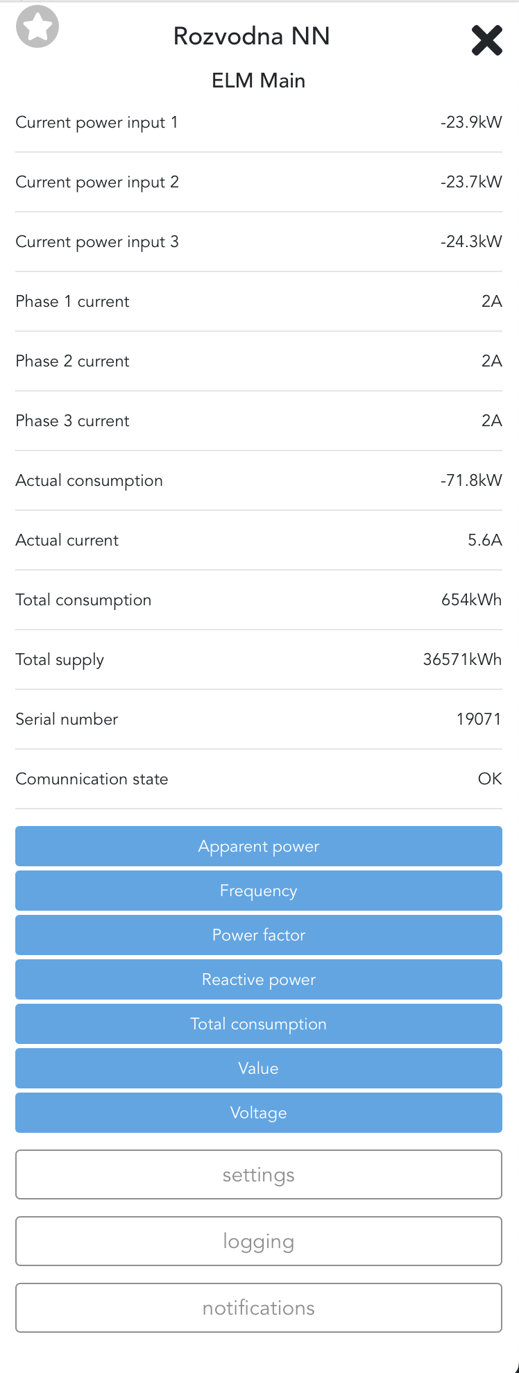 Device is showing at the bottom actual consumption value. More information can be found after clicking on the device. Besides information about phase power, current, frequency or for example power factor, it is also possible to turn on logging of values measured by energy meter. These values can be used again in dashboards or for troubleshooting.