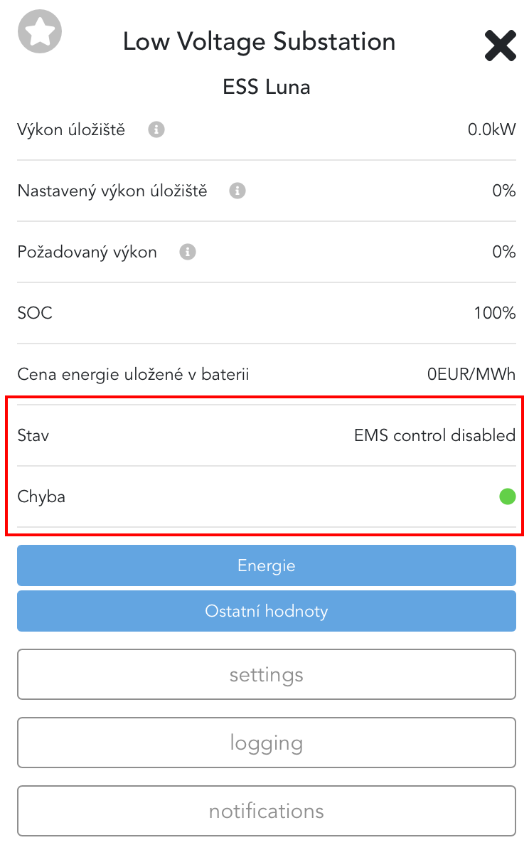 In such case, more information about error can be found after clicking on a component. As seen below, state is now "EMS control disabled" as a reaction to this error, and error indicator is now green.