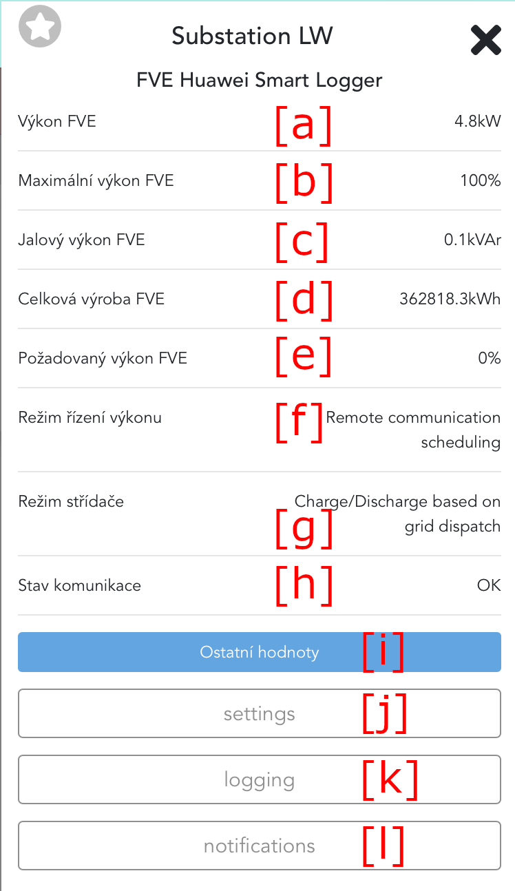 Devices displays at the bottom actual power production. More information can be shown after clicking on device. Based on user permissions different settings are available. Simple user cannot change settings, with higher permissions it is possible to change address, maximal power, dispatch control, manual control and others.