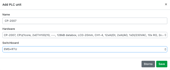 To add hardware, we use button "Add HW" on top left corner. From documentation we know type of PLC, in this case it is CP-2007.