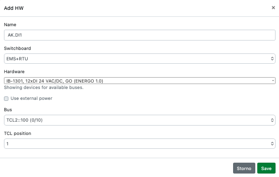 From documentation we know, that two modules for digital inputs IB-1301 are used. Again using "Add HW", we choose IB-1301 hardware this time, with corresponding address on TCL bus. Address is in documentation highlighted on these modules next to rotatory switch with red circle. First expansion module has the TCL position 1 by standart, second expansion module has TCL position 2. These addresses must be set correctly for proper functionality!