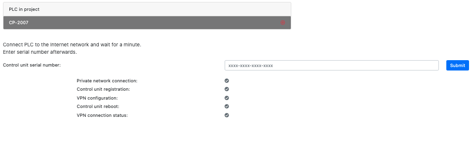 if entered correct serial number, after "Submit" the verification is performed, whether the PLC is connected to the server and is waiting for assignment to the project. If so, 5 green checkmarks will appear one after another and PLC will be connected with the project. Since this moment it is possible to send programme to PLC and work on project configuration.