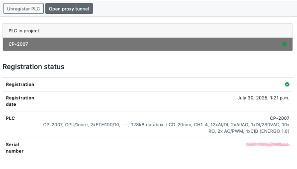 if registration is not performed, usually there is a problem with internet connection on PLC. VPN connection state can be verified on PLC's display as well.