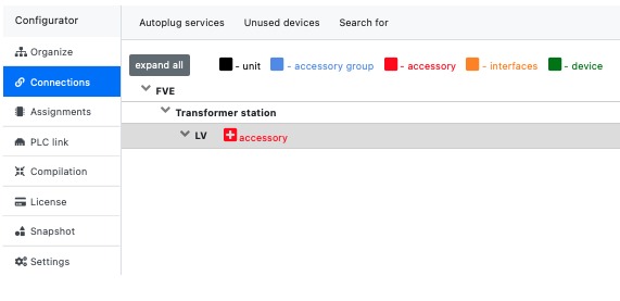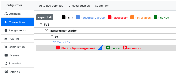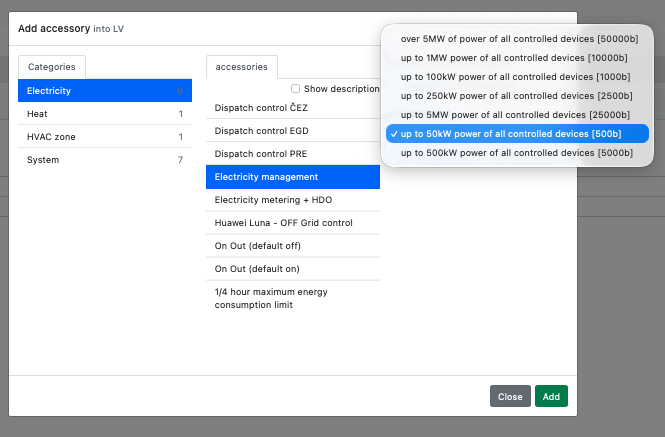Expand the menu "Transformer station / LV" and click on item "accessory". Menu will open, offering the accessory, which can be added into this category. Search in category "Electricity" for service "Electricity management". After selecting the service, we can overwrite the label (name it for example "Energocenter") using item "Custom service description", under which it will be shown in configurator. Also use item "Parameters" to select proper power plant size, since license pricing is based on it. Information about power plant size can be found in checklist - in this case it is "up to 50kW power of all controlled devices".