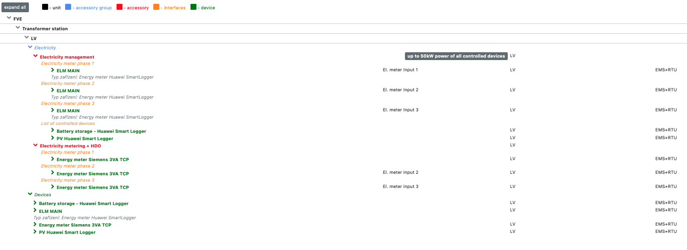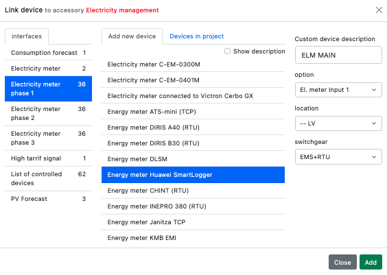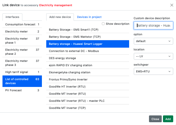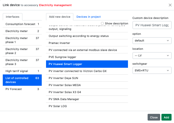 From single-pole project diagram we know, that for management of pv inverters is used only Huawei Smart Logger. Using button "Device" on "Electricity management" we display the menu with available devices. This time, we select "List of controlled devices" and "PV Huawei Smart Logger" and then click "Add".