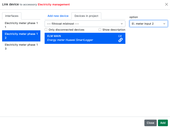 Based on single-pole project diagram we know, that electricity meter is connected into Smart Logger and thus this will be our source for measuring. We recommend to label the device for better clarification of its purpose (whether main, secondary measurement for PV or BESS) like "ELM MAIN". For electricity meters measuring 3 phases it is required to "Add new device" for 1st phase and for remaining two phases pick the meter from existing devices and only map the information from meter to correct phase. Now, for item "Option" we choose "El. meter Input 1".