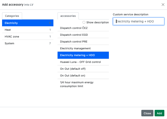 On hierarchical level of project "LV" click on "Accessory". In menu then select category "Electricity" and as a service choose "Electricity metering + HDO" and click "Add".