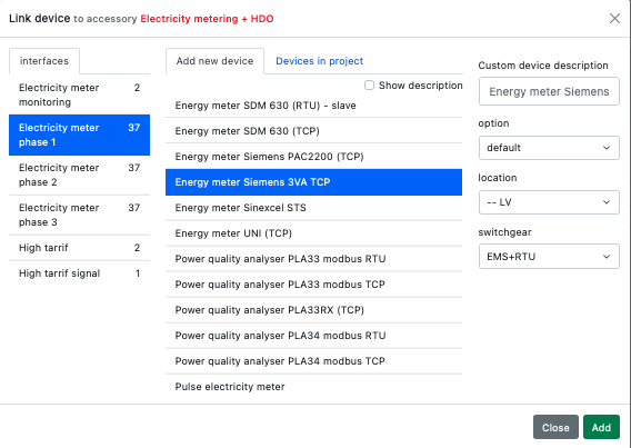 Under newly created category it is possible to add the electricity meters for auxiliary measurement. In category "Electricity metering + HDO" click on option "Device". In menu then for "Electricity meter phase 1" select based on documentation "Energy meter Siemens 3VA TCP". We follow the procedure used for main electricity meter to add the meter mapping for phases 2 and 3.