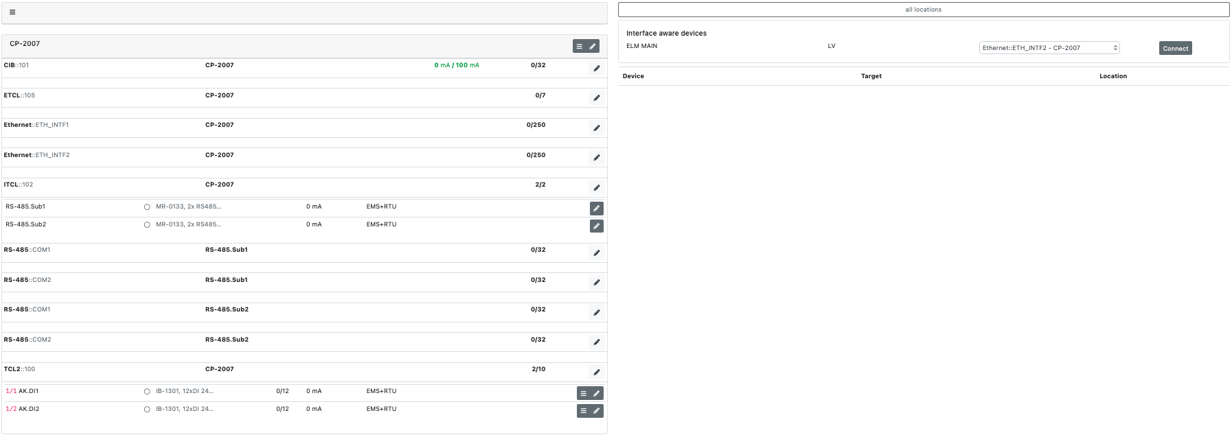 Project usually consists of devices and peripherals, for which is crucial to specify on which input or output they are connected. In this project it is only needed to define interface for electricity meter "ELM Main". In right column then select proper interface (electricity meter / Smart Logger is connecter on port ETH2) and click "Connect".