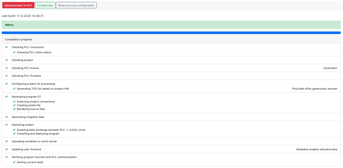 At this point project is configured and it is possible to try compilation, which verifies that all devices and services are configured as required. In menu "Compilation" click "Compile test". As soon as everything is done without any problems, it is possible to click "Upload project to PLC", which will create project on PLC including web interface.